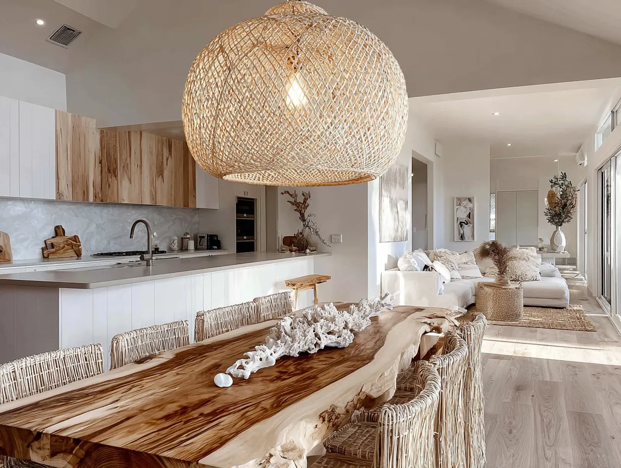 * **Lighting:** A statement pendant light, perhaps woven or glass, and soft ambient lighting. ✨
