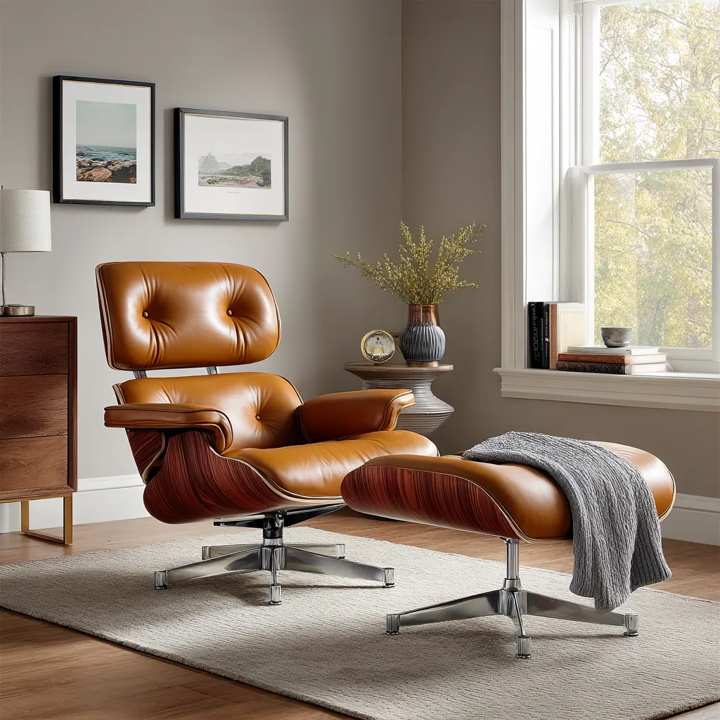 Think iconic designs like the Eames Lounge Chair, Womb Chair, or Scandinavian-inspired silhouettes with exposed wooden frames. Materials range from rich leathers and textured fabrics to molded plywood. 🤍