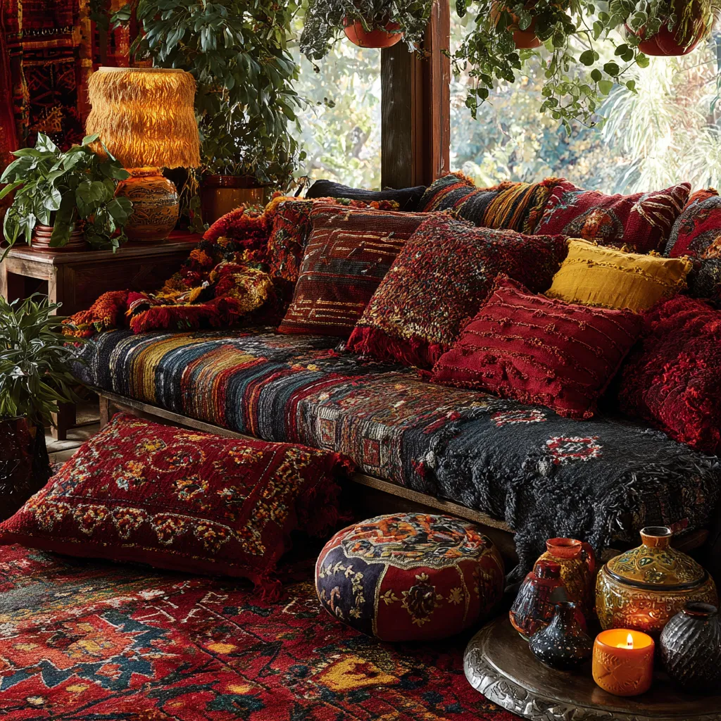 Layering is key! Think diverse textures: a woven jute rug, velvet cushions, chunky knit throws, and perhaps a Kilim tapestry. Embrace a rich, warm color palette with pops of jewel tones. Don't shy away from vintage finds and global-inspired pieces. Plants are a non-negotiable for that earthy, lived-in feel. 🌿