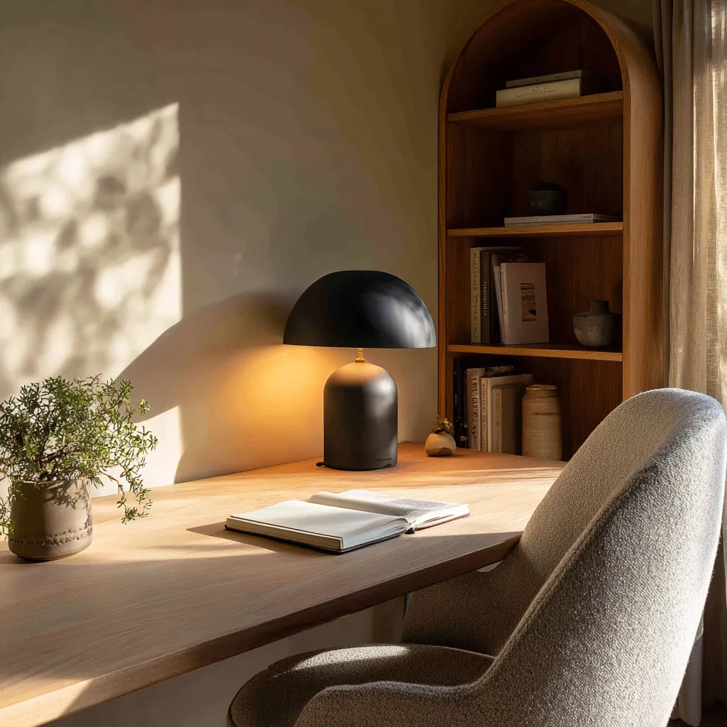 * **Soft Lighting:** A task lamp with a warm glow and possibly natural light from a window.