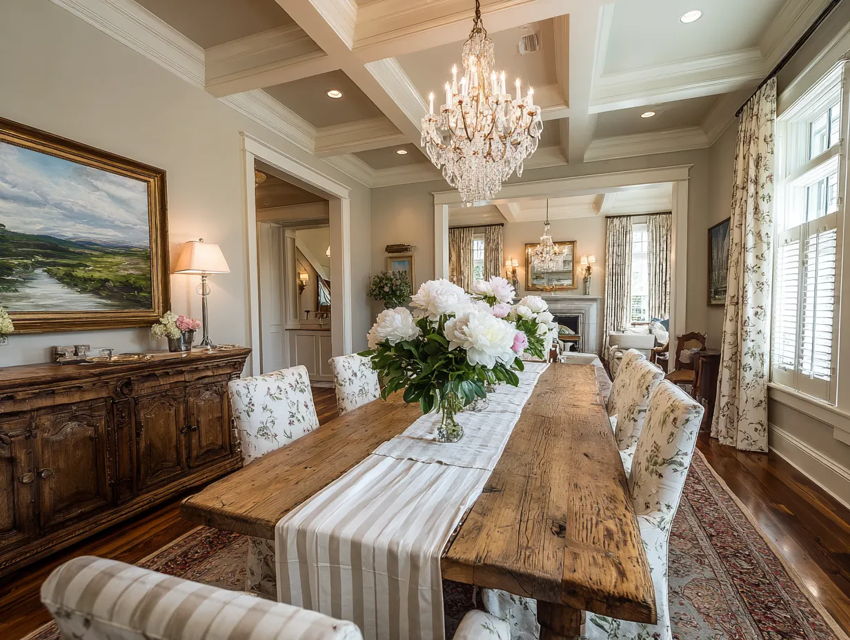 Layer the space with a vintage rug, and adorn the table with antique tableware, crisp linens, and a beautiful floral centerpiece. Soft lighting from a classic chandelier or wall sconces enhances the romantic atmosphere. It’s all about creating an inviting space for memorable gatherings.