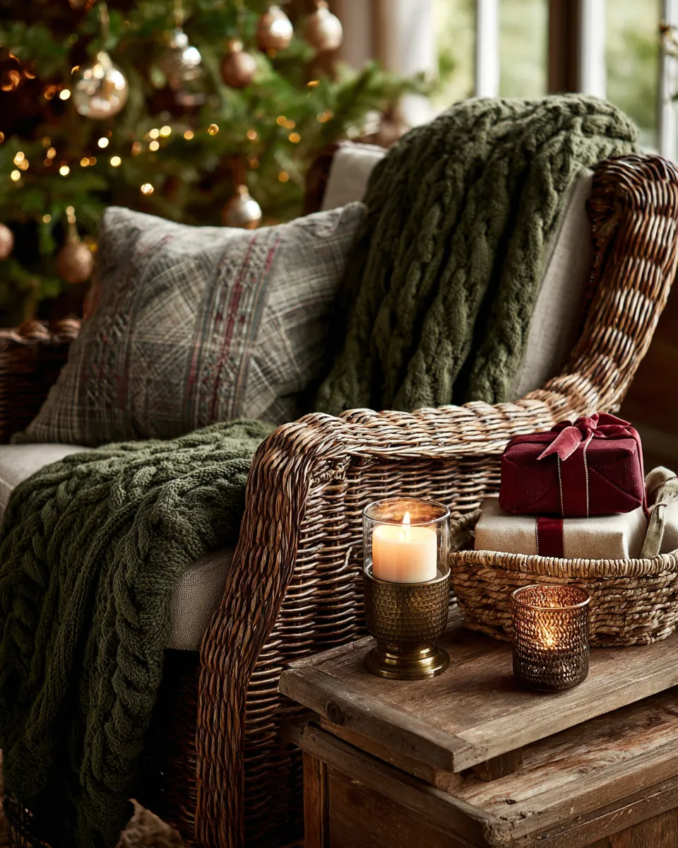 * **Natural Elements:** Embrace woven baskets for gifts and wooden ornaments. The raw, imperfect grain adds depth.