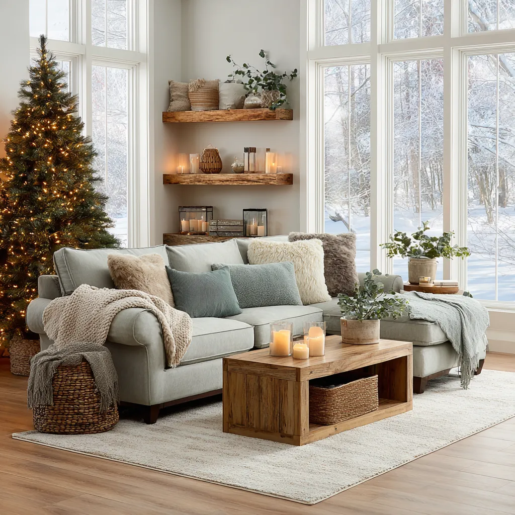 • **Color Palette:** Stick to muted whites, creams, soft grays, and natural wood tones, accented with subtle festive colors.
