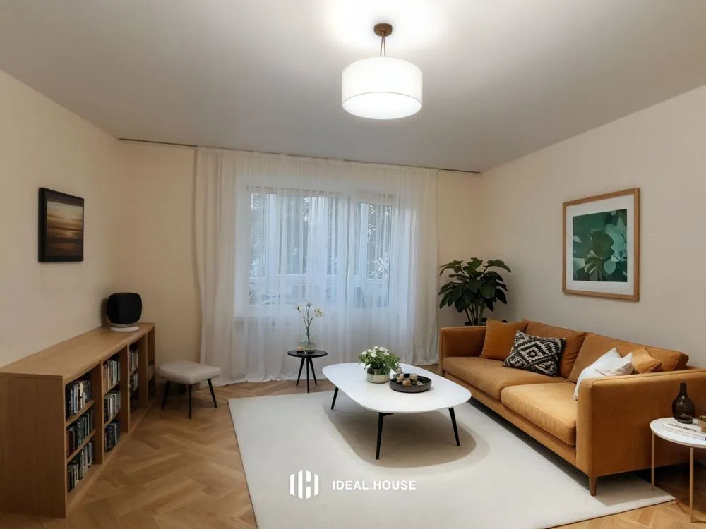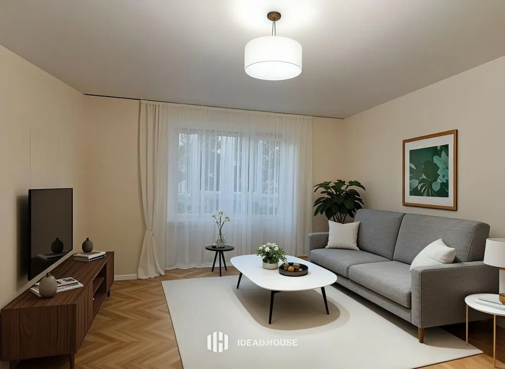 a room with white and black marble walls, gray furniture, and a black marble staircase