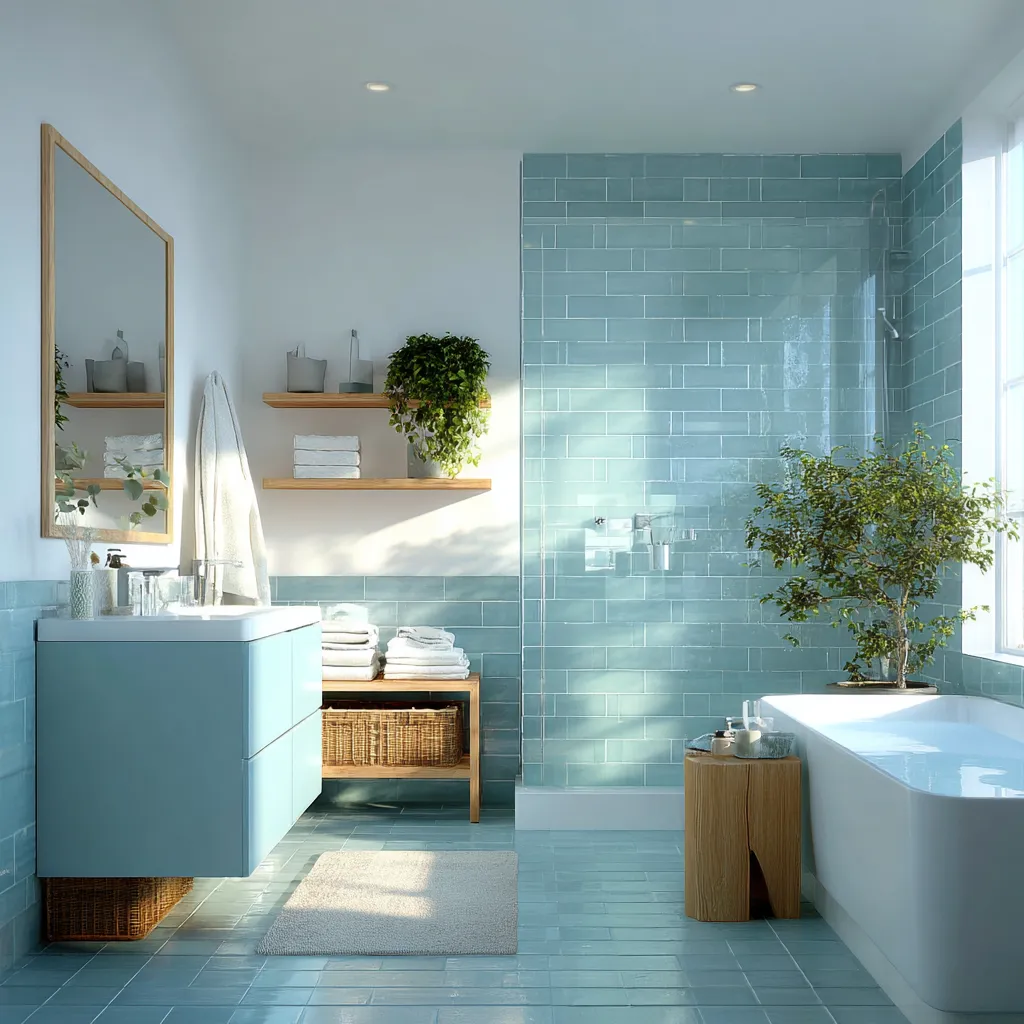 Seeking a spa-like escape? ☁️ Achieve serene Scandinavian bathroom vibes with a calming sky blue and crisp white palette. Imagine clean white subway tiles paired with a soft sky blue vanity or bath accessories. Incorporate natural wood elements like a teak stool or shelving, and minimalist hardware for a touch of warmth. ✨ This combination creates a bright, airy, and incredibly peaceful atmosphere. Save this for your dream minimalist bathroom!