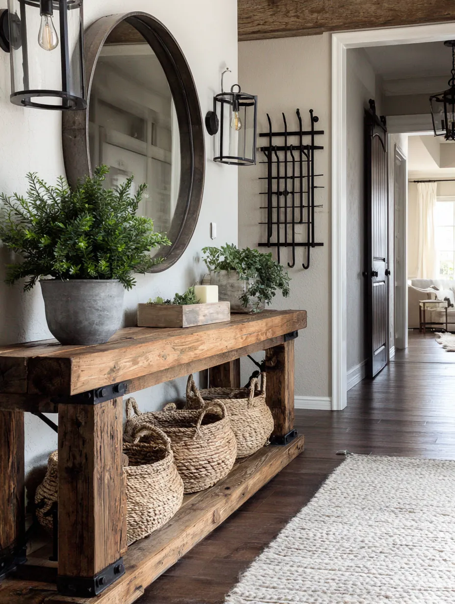First impressions matter! Your entryway sets the tone for your entire home, and an industrial farmhouse welcome is all about character and function. Think a sturdy, distressed wood console table topped with woven baskets for storage and a statement mirror with a metal frame. 💡 Add a touch of nature with a large potted plant or some rustic greenery. Don't forget practical elements like a cast iron coat rack or a vintage-inspired bench. This style brings warmth, durability, and a touch of the outdoors in. Save this for your entryway makeover! #IndustrialFarmhouseEntryway#EntrywayIdeas#FarmhouseEntry#IndustrialEntry#HomeEntryIdeas#DecorInspiration#HallwayDecor#FrontDoorStyle#WelcomeHome#DesignIdeas
