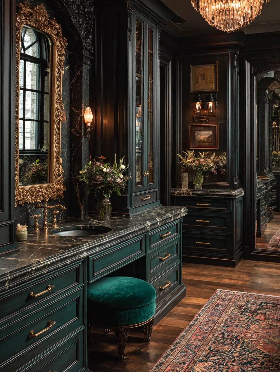 Start with a vanity area featuring a marble countertop and a plush, velvet-upholstered stool. Integrate ample, well-lit storage solutions – think custom cabinetry with brass hardware. Add a statement chandelier and an ornate full-length mirror. A luxurious rug underfoot and elegant drapery will complete the opulent feel. This is your personal haven for getting ready.