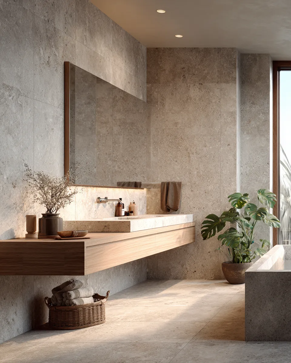Create a spa-like retreat in your bathroom by drawing inspiration from the raw beauty of stone. This natural material brings a sense of timelessness and grounding calm. Ideas to get you started: - **Stone Tile Floors:** Travertine, slate, or honed limestone for a sophisticated feel. - **Accent Walls:** A feature wall with rough-hewn stone or a textured concrete finish. - **Stone Vanity Tops:** Complementing the flooring with a cohesive, natural look. - **Minimalist Accessories:** Think smooth pebbles, bamboo accents, and simple linen towels. Allow the tactile qualities of stone to create a deeply peaceful and restorative space. Save this for your ultimate bathroom oasis! 💧