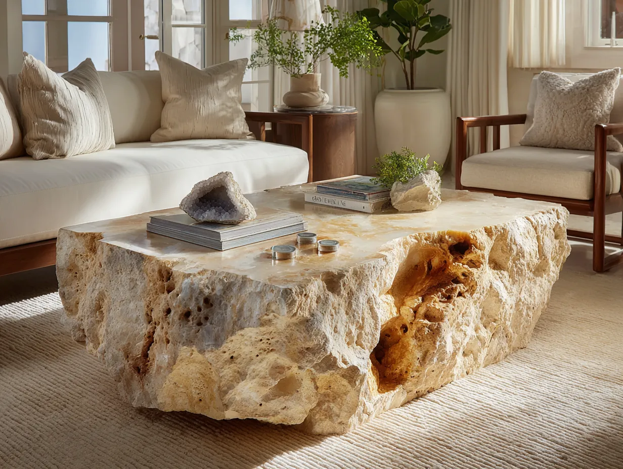 Make a statement in your living room with a coffee table crafted from natural stone. It grounds the space with its texture, weight, and timeless beauty.