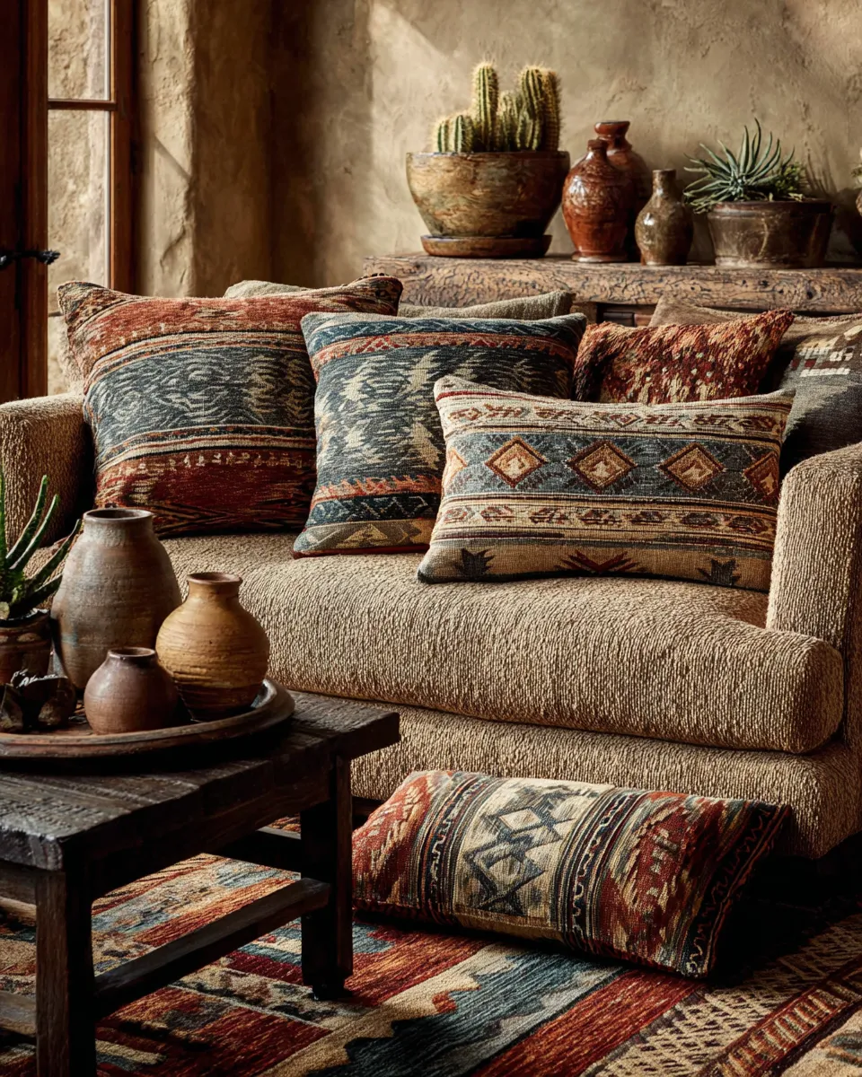 Save for your desert-inspired home! 🔥 #SouthwesternDecorIdeas#DesertLiving#RusticHome#EarthyInteriors#HandwovenTextiles#InteriorDesign#HomeDecorInspo#AdobeStyle#ArtisanalHome#DesignTrends