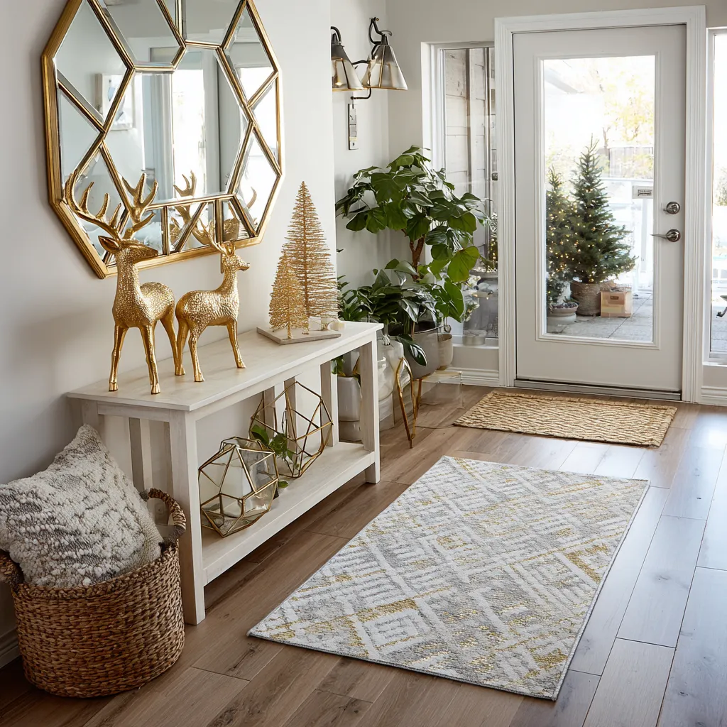 Consider incorporating a gold-accented welcome mat and perhaps a minimalist geometric wreath for a polished, sophisticated entrance. This creates an inviting ambiance that's both festive and aligned with your signature style. 🎄🌟