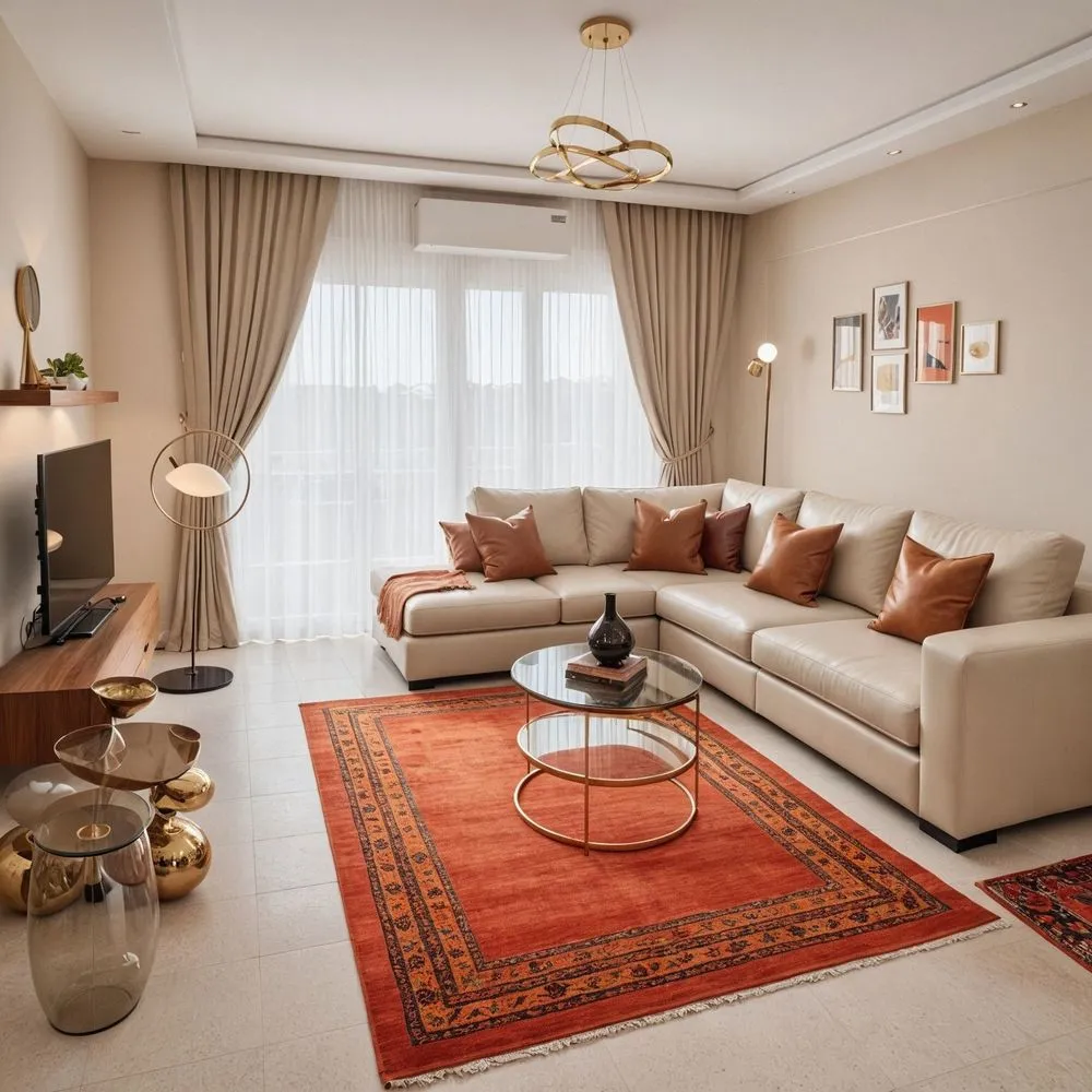 a white living room with an orange and red rug