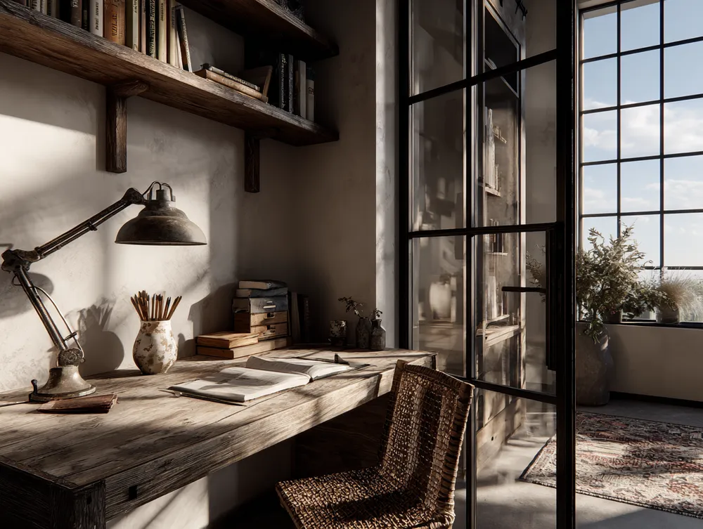 Design a home office that promotes focus and tranquility with Japandi style. This layout emphasizes clean lines, natural elements, and functional simplicity.