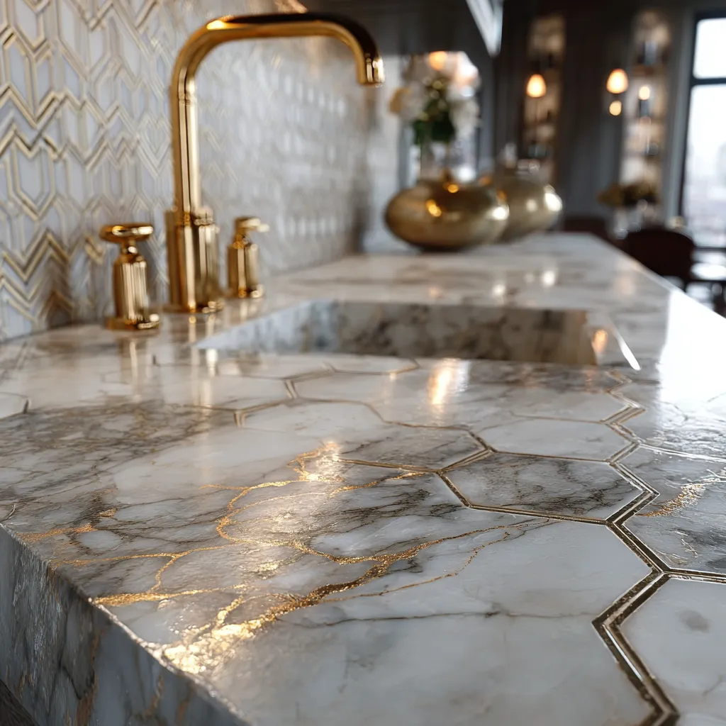 Your kitchen countertops are a canvas for Art Deco luxury! Opt for materials that exude sophistication and durability. Polished marble, with its natural veining and cool elegance, is a superb choice, offering both beauty and a classic Art Deco feel. For a bolder look, consider quartz or granite in deep, rich colors like black or dark green. High-gloss finishes will amplify the luxurious effect. Combining these with striking hardware or a patterned backsplash will create a truly dazzling Art Deco kitchen. What’s your dream countertop material? 🖤 #CountertopIdeas#ArtDecoIdeas#KitchenIdeas#HomeCountertopIdeas#DecorKitchenIdeas#ArtDecoKitchen#MarbleCountertops#LuxuryCountertops#KitchenDesign#HighGloss
