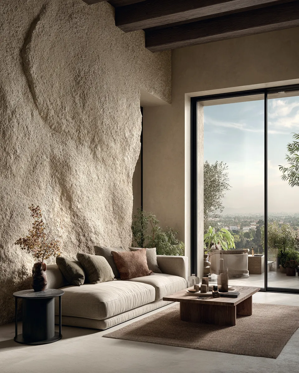 This material speaks volumes through its natural imperfections – subtle color variations, aggregate patterns, and a tactile finish. It pairs beautifully with natural wood and soft textiles for a balanced, modern aesthetic.