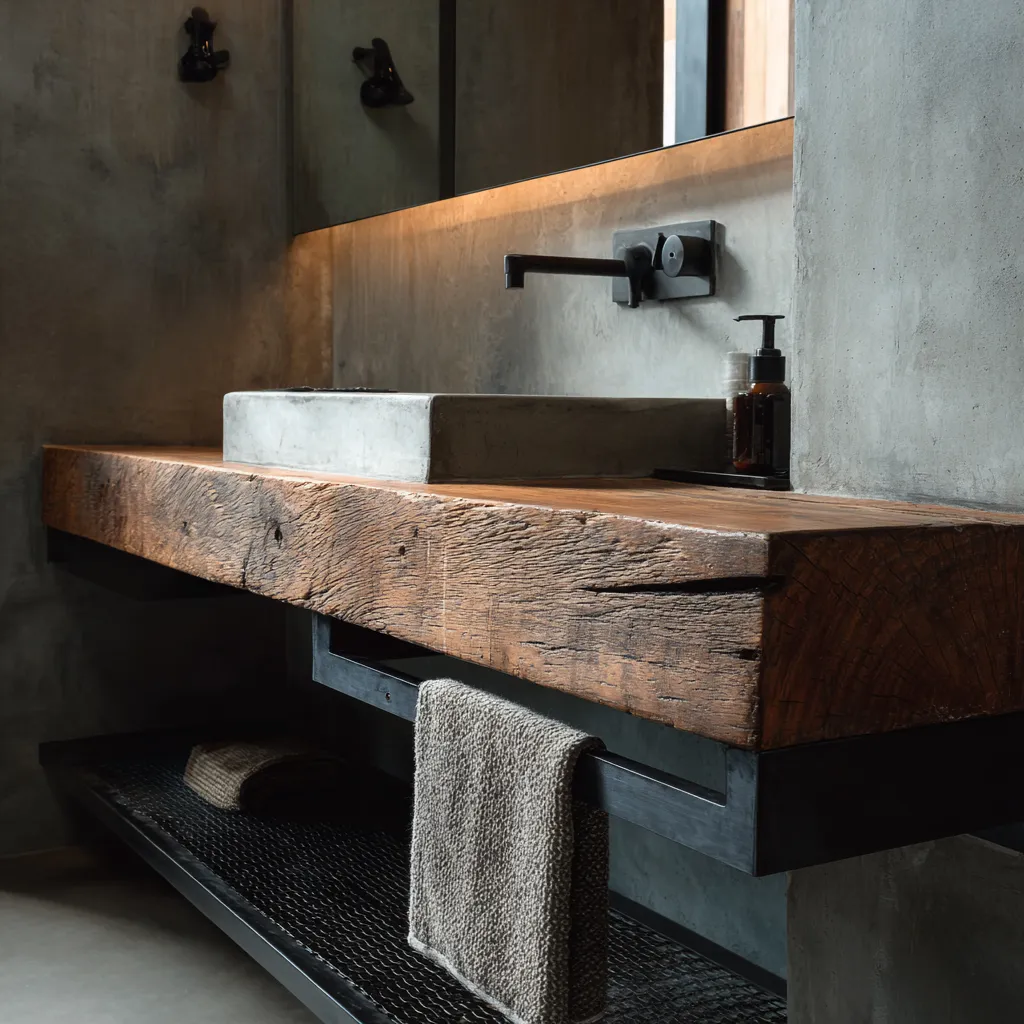 Ready for a bathroom vanity that’s built to last and packed with character? Industrial style is all about durability and raw beauty. Consider a floating vanity made from dark metal and a thick wooden top – it’s sleek and functional. Alternatively, a repurposed industrial cart or console table can add a unique touch. Pair it with a simple, minimalist vessel sink and matte black fixtures for a sharp contrast. Exposed pipe details or concrete sinks also fit the bill. 🛁 It’s about embracing the mechanical and the utilitarian for a spa-like feel. Save this for inspo! #IndustrialVanity #IndustrialVanityIdeas #BathroomVanityIdeas #BathroomIdeas #IndustrialDesign #MatteBlackFixtures #FloatingVanity #ConcreteSink #RawMaterials #BathroomRenovation #FunctionalDesign