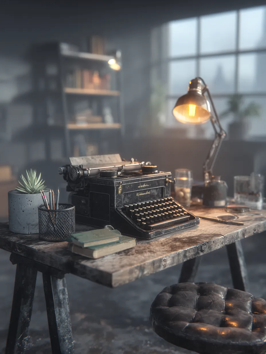 * **Textured Accents:** Leather desk mats, aged journals, and concrete planters.