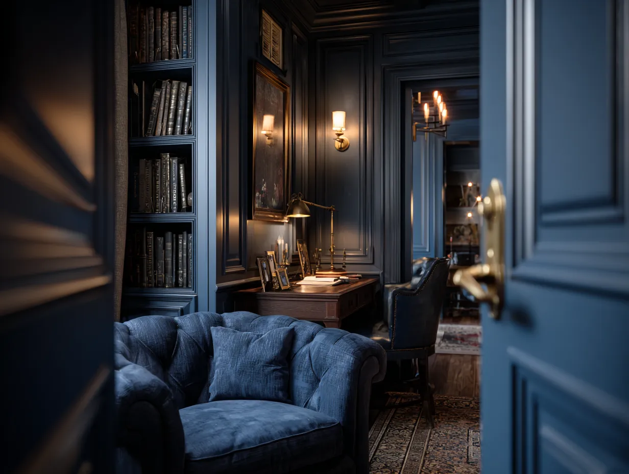 * **Deep navy or slate blue walls** for an enveloping effect.