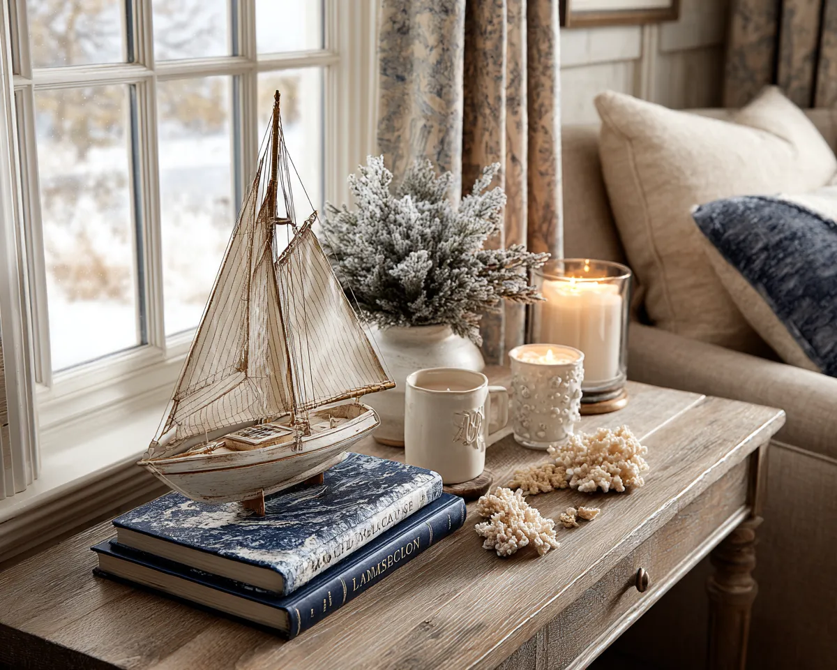 * A side table with a stack of nautical-themed books, a white coral accent, and a small sprig of evergreen.
