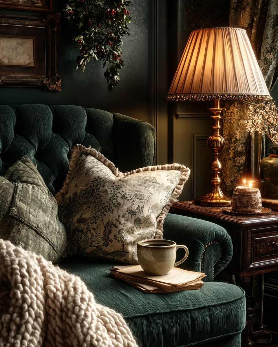 Start with a plush, overstuffed armchair in a rich velvet or a classic herringbone fabric. Drape a hand-knitted throw over the back and add a couple of lumbar cushions in festive, vintage patterns. For lighting, think warm and ambient: a brass floor lamp with a pleated shade and a cluster of battery-operated taper candles in antique brass holders. 🕯️