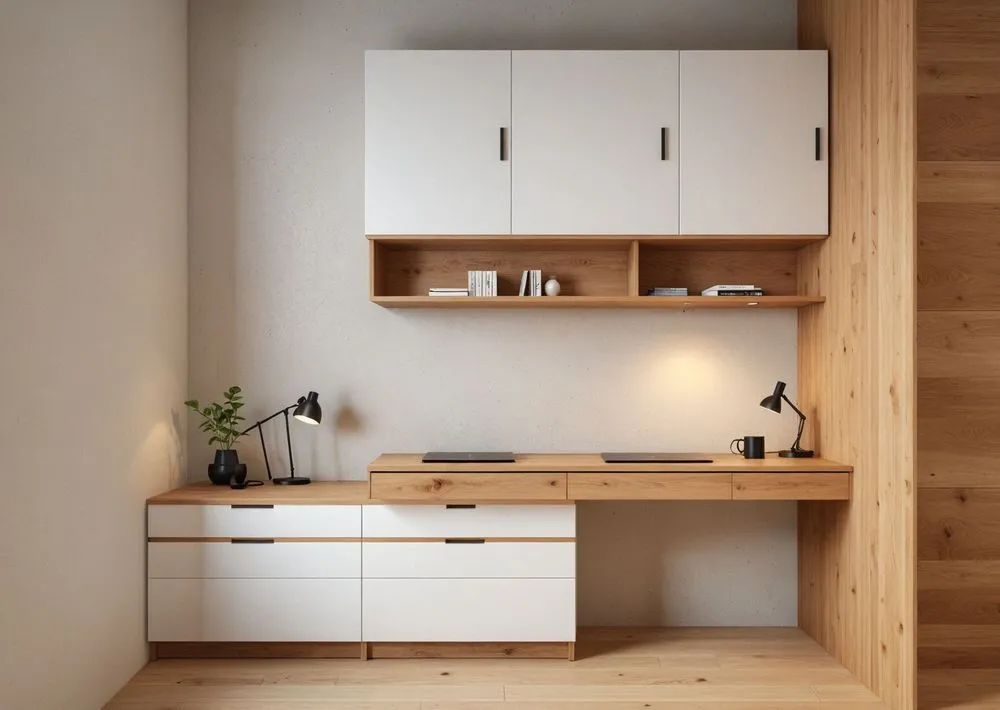 a modern desk with open storage drawers underneath