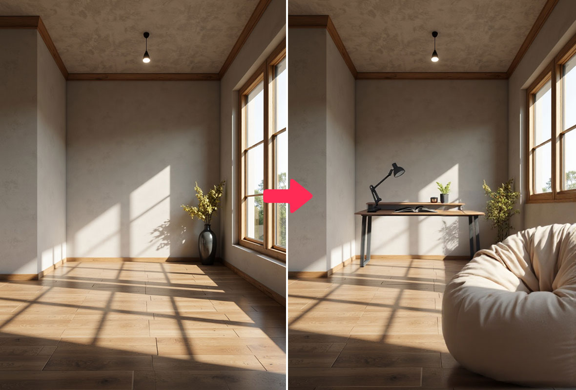 和装饰品到房间图像中的技术,提升它们的视觉吸引力,用于营销目的。